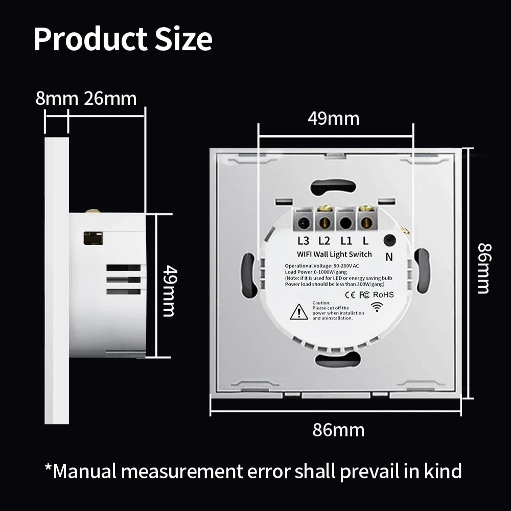 Tempered glass touch screen of this smart switch is sensitive to the touch of control, premium durable glass material provides up to 20 million touch figures through our rigorous testing. It is water-proof,Damp-Proof, Resists Scratches.
